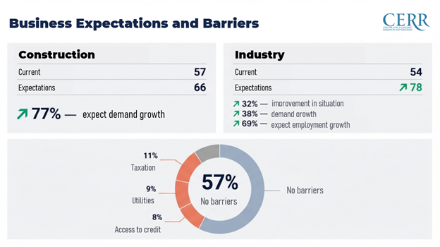 According to the survey, the share of respondents reporting an improvement in business conditions over the past three months reached 32%, compared to 30% a year earlier. Demand growth over the same period was noted by 38% of industrial enterprises versus 36% in January last year. Meanwhile, employment expansion plans strengthened — 69% of entrepreneurs expect to increase their workforce in the next three months, compared to 62% a year earlier.