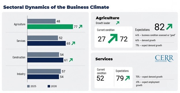 In agriculture, the Business Climate Index increased by 62% year-on-year and reached 77 points, compared to 48 points in January 2025.