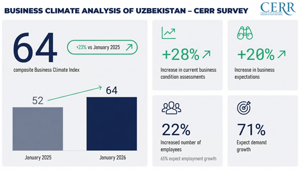 In January of the current year, Uzbekistan’s composite Business Climate Index stood at 64 points (on a scale from −100 to +100), which is 23% higher than the level of 2025.